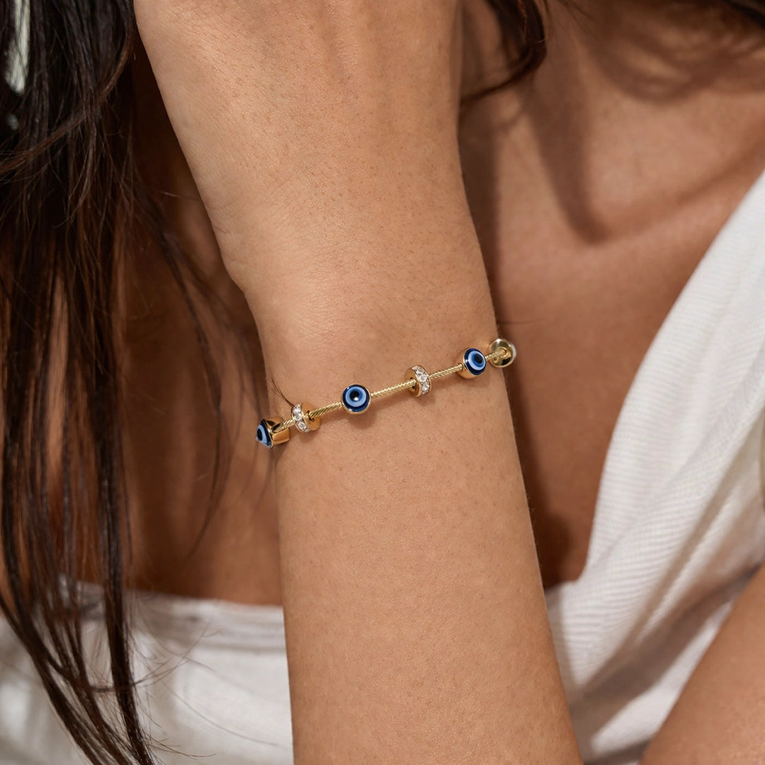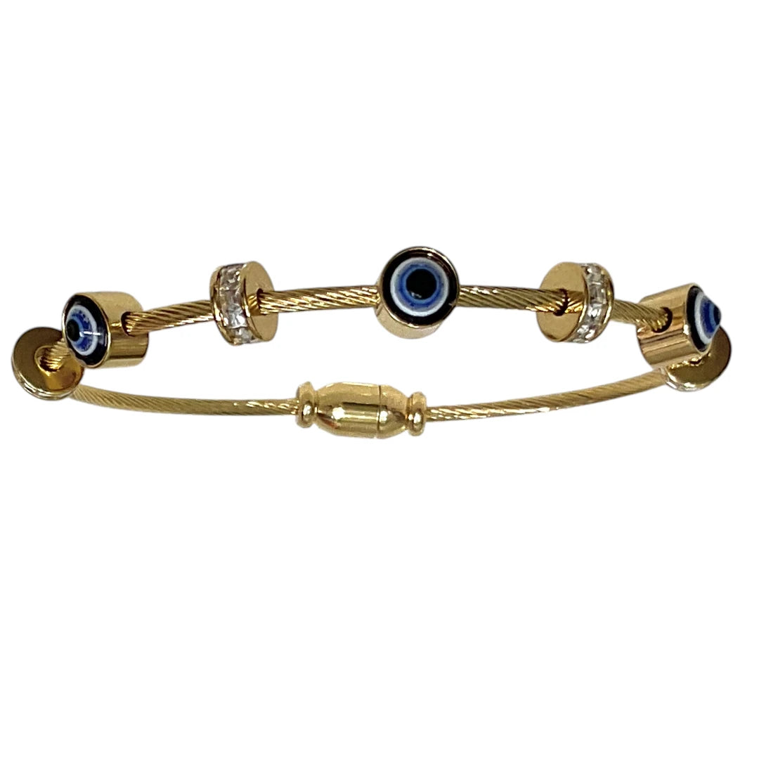 Ward off negativity in style with our Blue Aura Evil Eye kada. Featuring shimmering gold-plated cable wire adorned with vivid blue evil eye charms and sparkling crystal spacers, this piece blends timeless protection with modern elegance. Crafted to be waterproof, tarnish-free, and hypoallergenic, it’s perfect for everyday wear while keeping you surrounded by good vibes and positive energy.